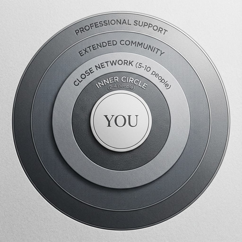Try This: Create a support inventory. Draw the concentric circles and write names in each one. Then note what type of support each person provides. Look for gaps. Do you have emotional support but no practical help? Lots of people who care but no one who really understands your specific loss? This isn't about judging what you have; it's about identifying what's missing so you know where to focus your energy.