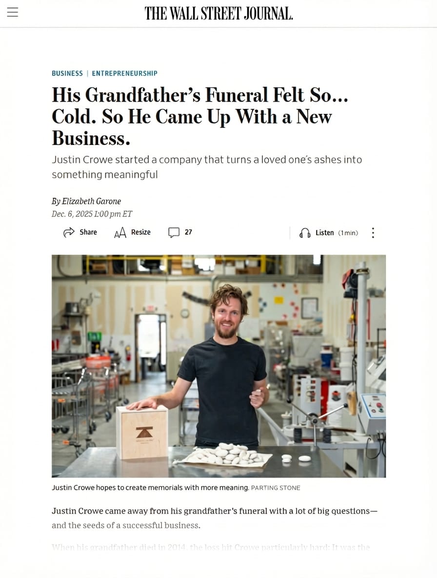 We’re thrilled to share that Parting Stone and our founder, Justin Crowe, were recently featured in The Wall Street Journal — a milestone moment in our mission to redefine how people honor and remember their loved ones.